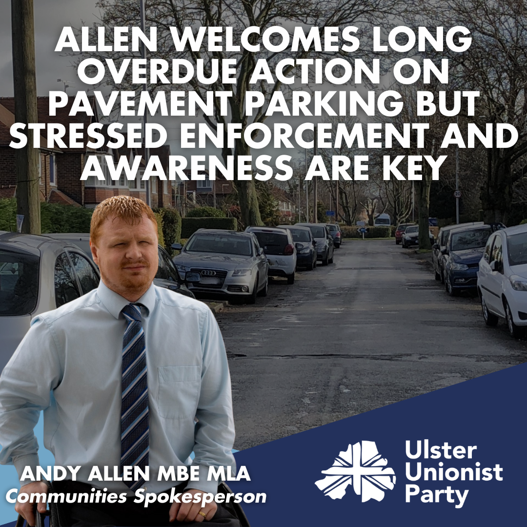 Responding to the announcement from Infrastructure Minister Liz Kimmins on plans to tackle inconsiderate pavement parking, Ulster Unionist MLA Andy Allen MBE, who has long campaigned on this issue, welcomed the commitment to introduce secondary legislation but warned that the proposed measures, in isolation from enforcement and awareness, will not be enough to address the wider problem.